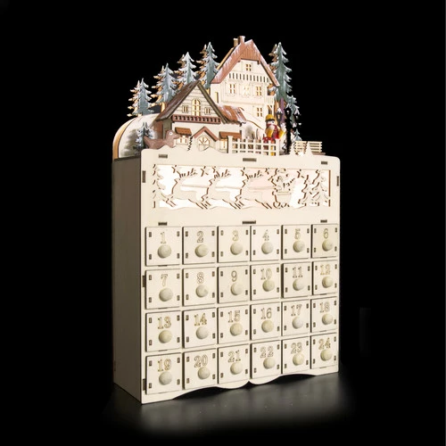 Personnalisez vous meme votre propre calendrier de l’Avent. Celui-ci est decore avec une scenette village en bois colore et traineau retroeclaire. Remplissez le de chocolats ou petits cadeaux. Laissez place a votre imagination. S’eclaire grace a des LED couleur blanc chaud. Hauteur 36cm, longueur 22,5cm et largeur 9cm. Fonctionne avec des piles.