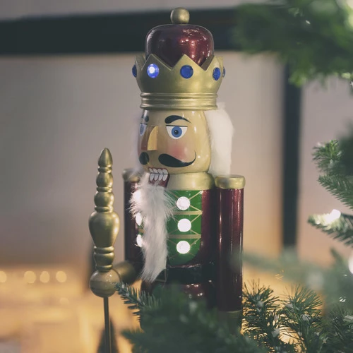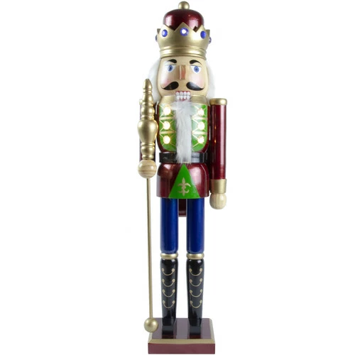Succombez a la folie des casse-noisettes en bois. Piece incontournable et tendance, il s’ajoutera parfaitement a votre decoration. Bouche articulee tel un vrai casse-noisettes, avec couronne et sceptre. Couleur bordeaux. Ses effets lumineux sauront ravir petits et grands. Hauteur 61 cm. Fonctionne avec des piles.