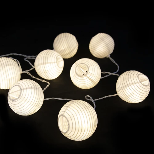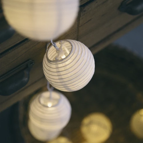 Guirlande agrementee de lanternes en papier blanc d’une longueur de 1,60m. Ideale pour decorer une chambre, un meuble ou un contour de fenetre, effet cocooning garanti. Fonctionne avec des piles.