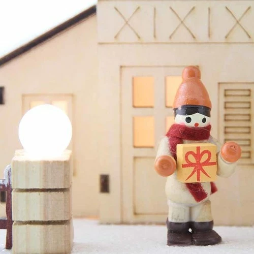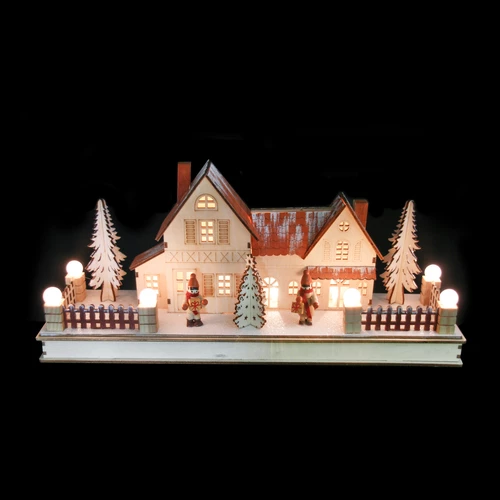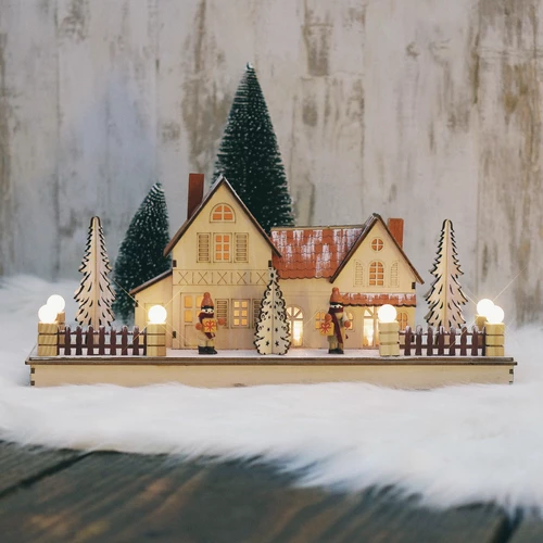 Sublimez votre decoration de Noel avec cet h?tel en bois enneige et sujets colores . Ses petits details, decoupes et ornements sublimeront et eclaireront avec des LED blanc chaud vos espaces. Couleur bois naturel et effet neige paillete. Longueur 38,5cm, largeur 10cm et hauteur 17,5cm. Fonctionne avec des piles.