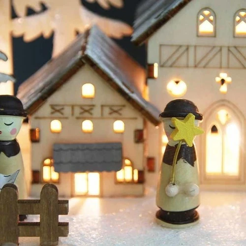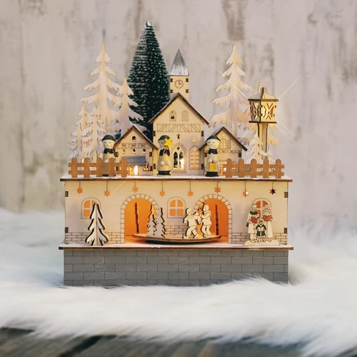 Sublimez votre decoration de Noel avec ce manege en bois enneige anime et muscial. Ses petits details, decoupes et ornements sublimeront et eclaireront avec des LED blanc chaud vos espaces. Couleur bois naturel et effet neige pailletee. Longueur 22cm, largeur 12cm et hauteur 24,5cm. Fonctionne avec des piles.