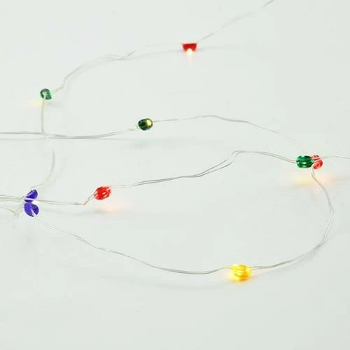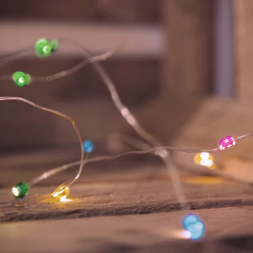 Guirlande fil cuivre de 2m avec gouttes de couleur rouge, vert, jaune et bleu. Elle egayera votre decoration interieure avec ses couleurs. Ideale pour decorer une table, un contour de fenetre ou encore a l’interieur d’un vase pour creer encore plus d’effet. Pratique avec le boitier a pile qui peut se ventouser sur vos surfaces. Fonctionne avec des piles.
