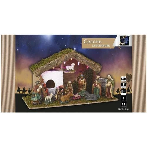 Crèche lumineuse LED + 11 santons, bois, porcelaine, dimensions L. 47.2 x l. 17.5 x H. 24.5 cm
