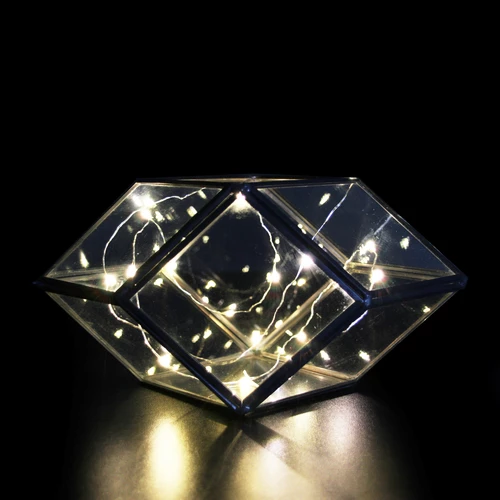 Lanterne en verre a poser, en forme de diamant. C’est une piece intemporelle que vous pourrez decorer et accessoiriser au gre de vos envies et des saisons – fleurs sechees, plantes ou guirlandes lumineuses…Tres tendance, elle est parfaite pour une decoration moderne et elegante. Fournie avec une guirlande fil cuivre de 20 LED couleur blanc chaud. Longueur 26 cm et largeur 11,5 cm. Fonctionne avec des piles.