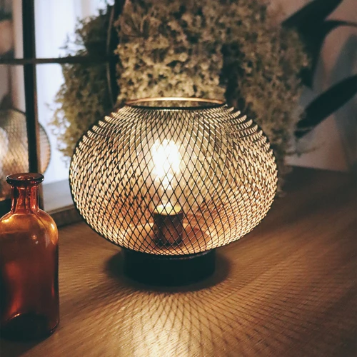 Lanterne a la forme originale avec ampoule retro qui apportera une lumiere douce a votre interieur.H16cm x D20cm Fonctionne avec des piles.