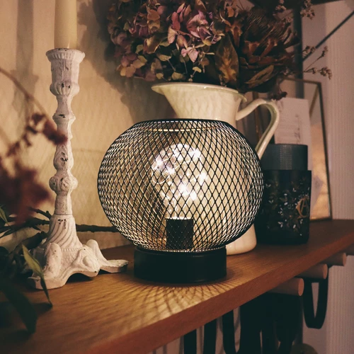 Lanterne a la forme originale avec ampoule retro qui apportera une lumiere douce a votre interieur. H15cm – Fonctionne avec des piles.