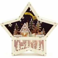 Apportez une touche d?originalite avec ce village en bois en forme d?etoile. Vous serez surpris de tous les details a observer?. Decor maison, sapins, etoiles? H33,5cm x L35cm, s’illumine grace aux LED blanc chaud. Fonctionne avec des piles.
