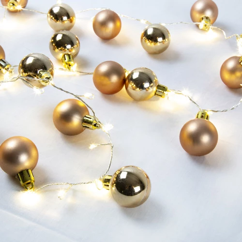 Guirlande 2 en 1. Agrementee de 24 boules PVC cuivre mat et cuivre brillant et LED blanc chaud, elle sera parfaite pour decorer votre sapin de jour comme de nuit en un tour de main… Diametre 3cm, Longueur 1,2 m. Fonctionne avec des piles.