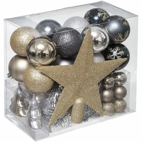 Avec ces décorations de Noël aux formats variés, ces guirlandes et ce cimier scintillant, ce kit fera de votre sapin le roi des fêtes pour cet hiver.FICHE TECHNIQUE- Kit de 44 décorations de noël en plastique.- 1 Guirlande argentée de 3 mètres.- 1 Cimier en forme d’étoile nacrée.- 2 sujets en forme de sapin.- 16 Boules grand modèle.- 24 boules petit modèle.- Couleur : Doré, Argent et Noir.CARACTERISTIQUES TECHNIQUES- Dimensions de la boite : Longueur 24 cm x largeur 13 cm x Hauteur 22 cm.- Taille des 16 grandes boules : Diamètre 6 cm, – Taille des 24 petites boules : Diamètre 3 cm- Longueur de la guirlande : 3 mètres – Dimensions du cimier en forme d’étoile : Hauteur 20 cm x Diamètre 2 cm- Poids : 0,287 kg