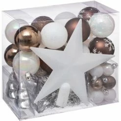 Avec ces décorations de Noël aux formats variés, ces guirlandes et ce cimier scintillant, ce kit fera de votre sapin le roi des fêtes pour cet hiver.FICHE TECHNIQUE- Kit de 44 décorations de noël en plastique.- 1 Guirlande argentée de 3 mètres.- 1 Cimier en forme d’étoile nacrée.- 2 sujets en forme de sapin.- 16 Boules grand modèle.- 24 boules petit modèle.- Couleur : Chocolat et blanc.CARACTERISTIQUES TECHNIQUES- Dimensions de la boite : Longueur 24 cm x largeur 13 cm x Hauteur 22 cm.- Taille des 16 grandes boules : Diamètre 6 cm, – Taille des 24 petites boules : Diamètre 3 cm- Longueur de la guirlande : 3 mètres – Dimensions du cimier en forme d’étoile : Hauteur 20 cm x Diamètre 2 cm- Poids : 0,287 kg
