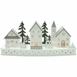 Sublimez votre decoration de Noel avec ce Village de Noel en bois colore. Ses petits details, decoupes et ornements sublimeront et eclaireront avec des LED blanc chaud vos espaces. Decor avec maisons, sapins, bonhommes… L44cm x H19.5cm x P12cm. Fonctionne avec des piles.