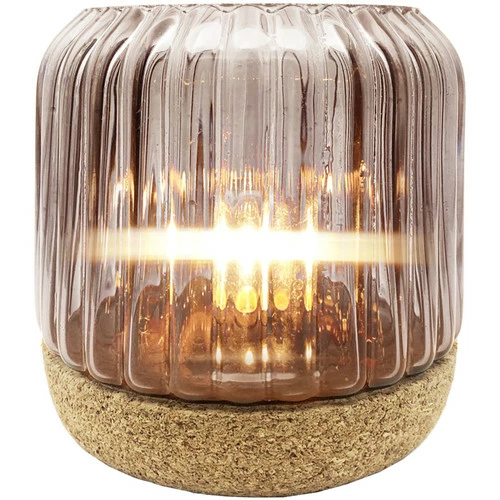 Lanterne decorative en verre rose avec un effet ondule et socle en liege. Grace a son ampoule LED, elle apportera une douce lumiere a votre interieur. H15cm x D14cm – Fonctionne avec des piles.