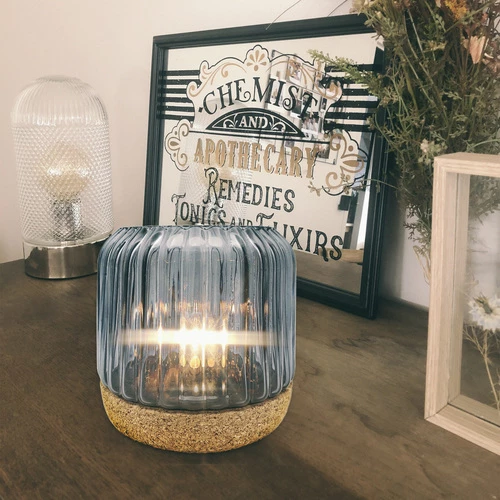 Lanterne decorative en verre violet avec un effet ondule et socle en liege. Grace a son ampoule LED, elle apportera une douce lumiere a votre interieur. H15cm x D14cm – Fonctionne avec des piles.