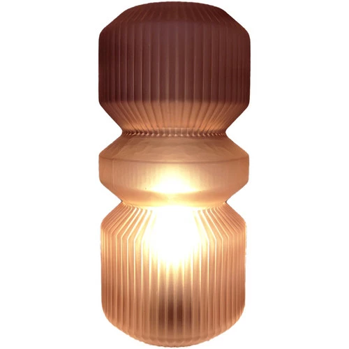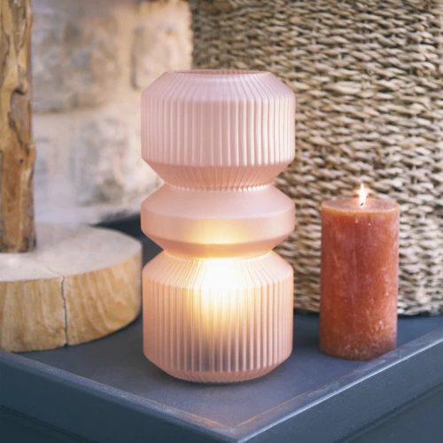 Lampe a poser en verre mat rose. H25cm x D12.5cm. Elle s’eclairera a l’aide de son ampoule LED. Aussi elegante eteinte qu’allumee, agrementez la avec des feuilles ou des fleurs seches. A poser sur un meuble, une table ou etagere… Fonctionne avec des piles.