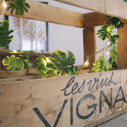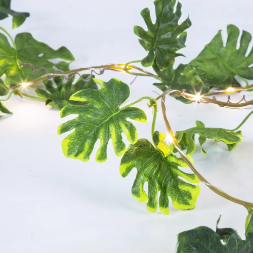 Craquez pour a cette jolie guirlande en feuillage type feuille de monstera d’une longueur de 1,90m. Tres tendance, vous pourrez l’utiliser pour une decoration de table ou dans un vase par exemple, elle eclairera grace a des LED couleur blanc chaud. Fonctionne avec des piles.