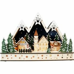 Sublimez votre decoration de Noel avec ce Village de Noel en bois colore. Ses petits details, decoupes et ornements sublimeront et eclaireront avec des LED blanc chaud vos espaces. Decor d’une nuit etoilee avec maisons, eglise, bonhommes… L45cm x H29.5cm x P9cm. Fonctionne avec des piles.