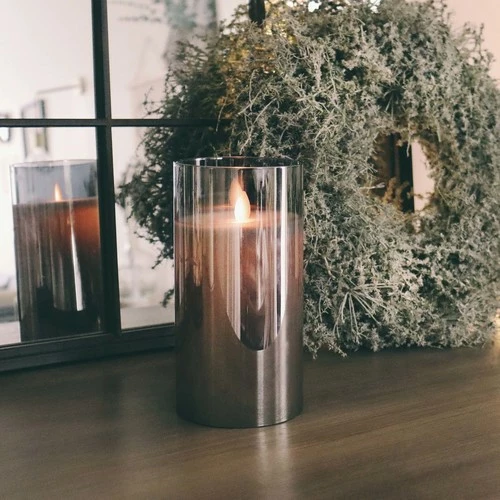 Vase en verre fume, telle une veritable bougie, la LED reproduira le vacillement d’une vraie flamme. Elle apportera un c?te chaleureux a votre interieur. Programmez l?allumage tous les jours a une certaine heure et une extinction automatique. Hauteur 18 cm et diametre 9 cm. Fonctionne avec des piles.