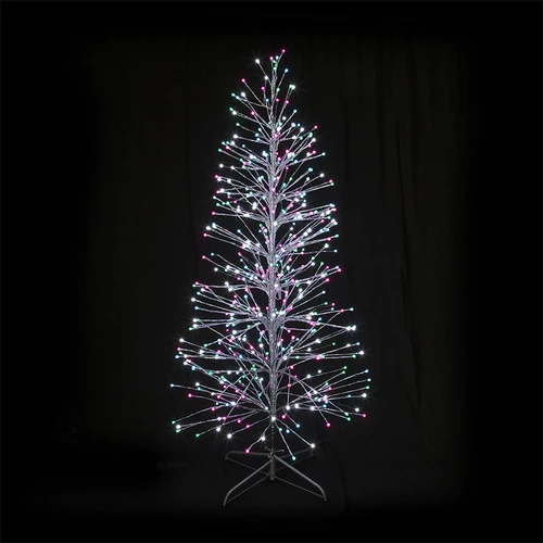 Cet elegant sapin aux couleurs multicolores et aux branches couleur argent pourra completer votre decoration traditionnelle en apportant une touche moderne ou remplacer votre sapin classique. Tres tendance il pourra egalement decorer vos vitrines et boutiques… Vous pourrez le fa?onner grace a sa structure metallique souple. Pret a decorer, il est deja agremente de boules decoratives et de LED multicolores. Hauteur 1,80 M et diametre 88cm. a brancher sur secteur.