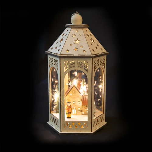 Amenagez votre propre village avec cette lanterne de Noel etoilee en bois naturel. Veritable lanterne traditionnelle qui s’illuminera tout en apportant un c?te chaleureux a votre decoration. Hauteur 30 cm, Diametre 17 cm. Fonctionne avec des piles.