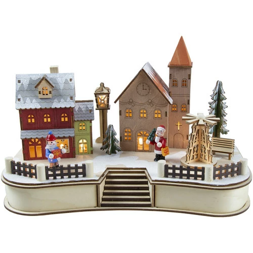 Veritable petite place de village miniature en bois avec Pere Noel, elle s’illumine grace a des LED couleur blanc chaud. Details colores, ornements… Apportez de la couleur a vos fetes de fin d’annee. Longueur 30cm, largeur 15cm et hauteur 19cm. Fonctionne avec des piles.