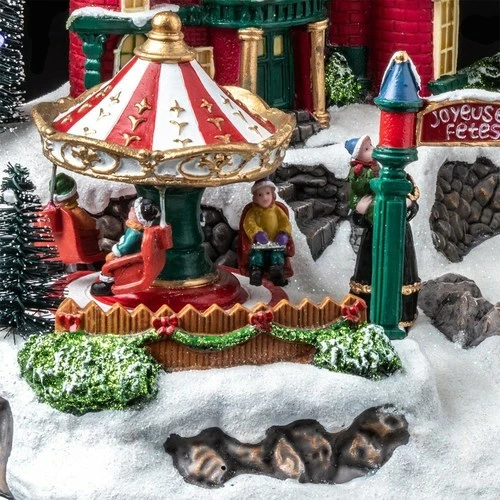 Village de Noël manège et forêt 18 LEDRéalisez le plus beau des décors de Noël grâce à ce village de Noël représentant un décor de manège avec une forêt. Créez une ambiance de fête qui émerveillera petits et grands. Le village s’illumine et les personnages s’animent pour plus de magie.Informations sur le Village de Noël manège et forêt 18 LED :Dimensions : L. 29,6 x l. 21,5 x H. 22,4 cmLumineux et animé18 LED multicoloresMatière : plastiqueUtilisation intérieure uniquementTransformateur inclus