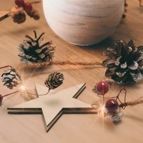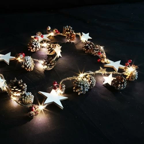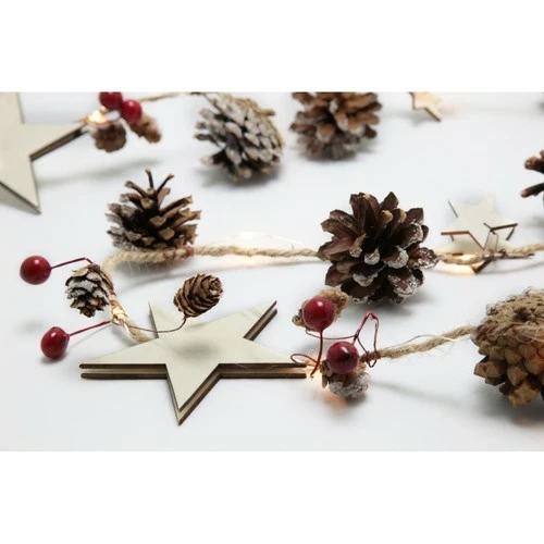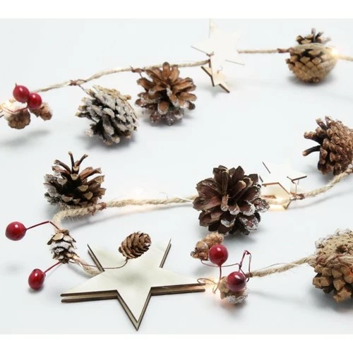 Guirlande decoration bois blanc agrementee d’etoiles et de houx d’une longueur de 2m. Decorez votre table de Noel, vos contours de porte ou fenetres, sapin? Fonctionne avec des piles.